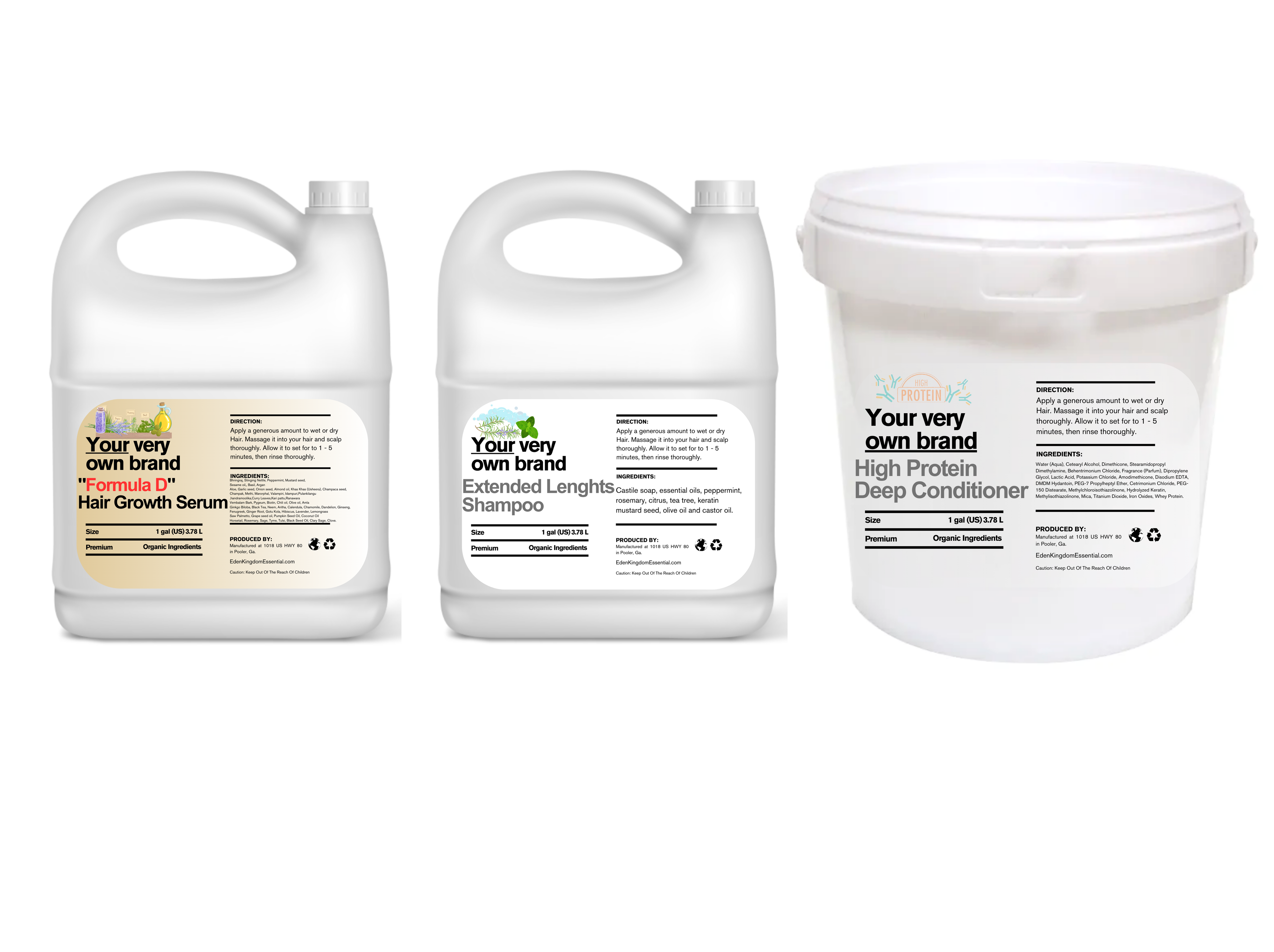 The oil, shampoo and conditioner comes in bulk 1 gallon sizes for you to label with your own company name.